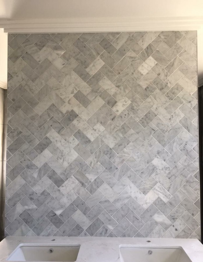 Herringbone feature wall in marble tiles